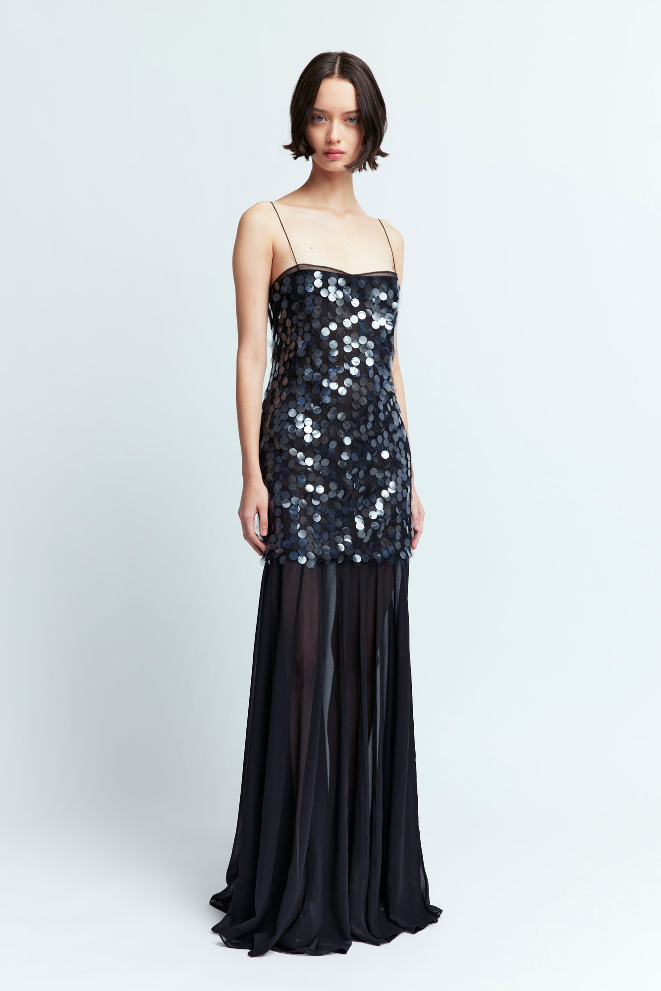 The Salia Gown in black is a floor-length dress with thin straps that tie at the low-cut back. The bodice features grey paillette sequins embroidered on sheer mesh, creating a scaled effect. A gathered georgette skirt flows effortlessly, contrasting with the fitted, sequin-embroidered bodice for a dynamic silhouette. MORE DETAILS Designed for a regular fit. The model is 5'10.5" (178cm) and wears a UK8. Outer: 100% Polyester Care: Hand wash only Made in Portugal Style number: G-069-SS25-1