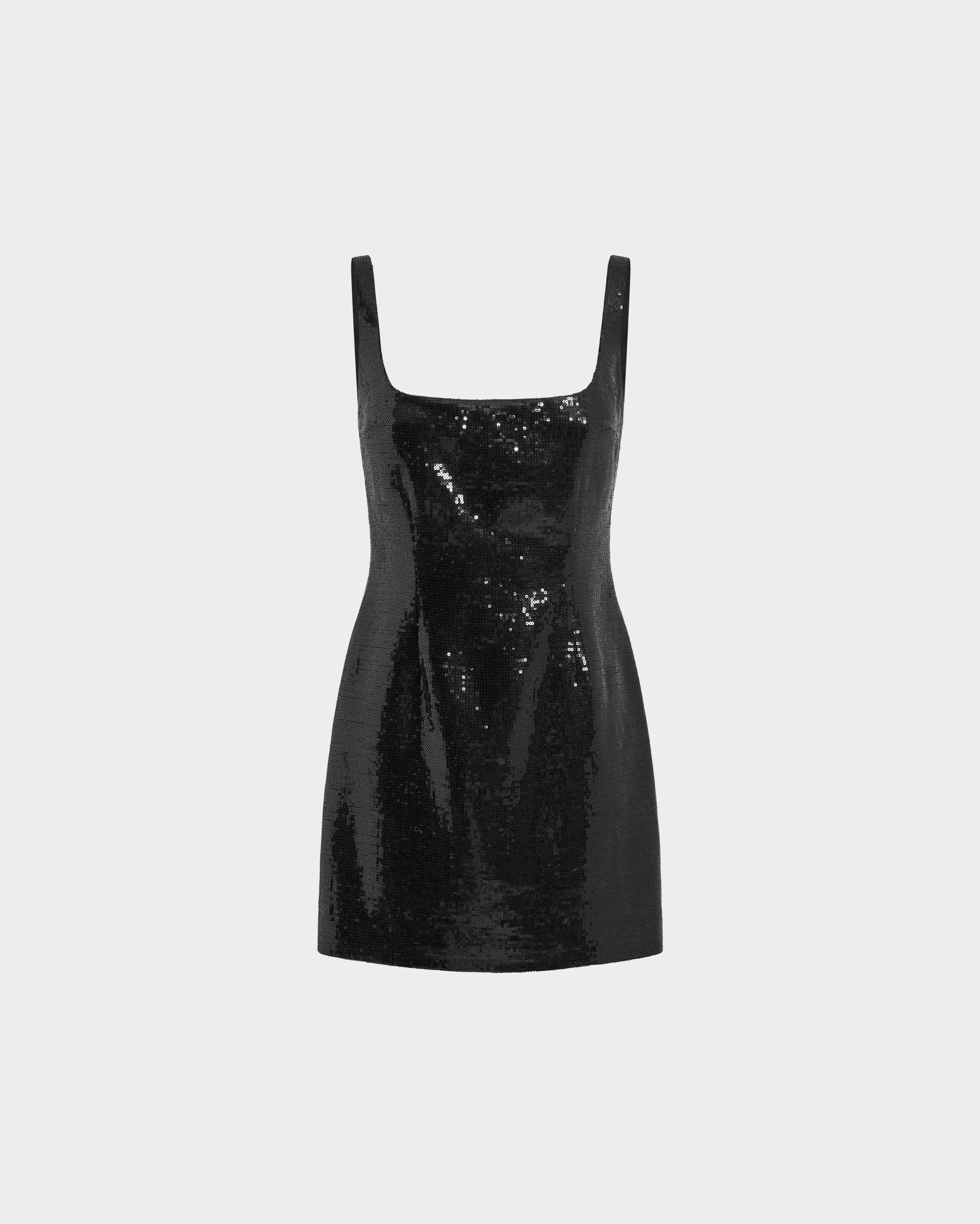 The Sior Mini Dress in black is a signature 16Arlington silhouette, crafted from lightweight linen with sequin embellishments throughout. Tailored for a slim fit, it features a square neckline and thin shoulder straps, offering a clean, structured finish. MORE DETAILS Designed for a slim fit. The model is 5'9.5" (176cm) and wears a UK 8. - Composition: 100% Polyester - Care: Specialist Dry Cleaning Only - Made in Portugal Style number: D-MN-560-AW25-HS-C