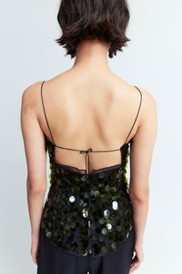 The Suero Top in green is crafted from mesh fabric adorned with grey paillette embellishments, creating a striking contrast against the black base. It features a square neckline and delicate thin spaghetti straps. The adjustable fit is achieved through thin, tipped straps that tie at the back. MORE DETAILS Designed for a regular fit. The model is 5'10.5" (178cm) and wears a UK8. - Outer: 100% Polyester - Care: Hand wash only - Made in Portugal Style number: T-324-SS25-2