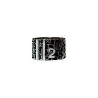 condition 8/10 color black × silver size 5 band width 2mm, ornament width 1cm, ornament length 1cm it has some scratches, the white part is peeling off a bit. free shipping worldwide (takes around 5days)