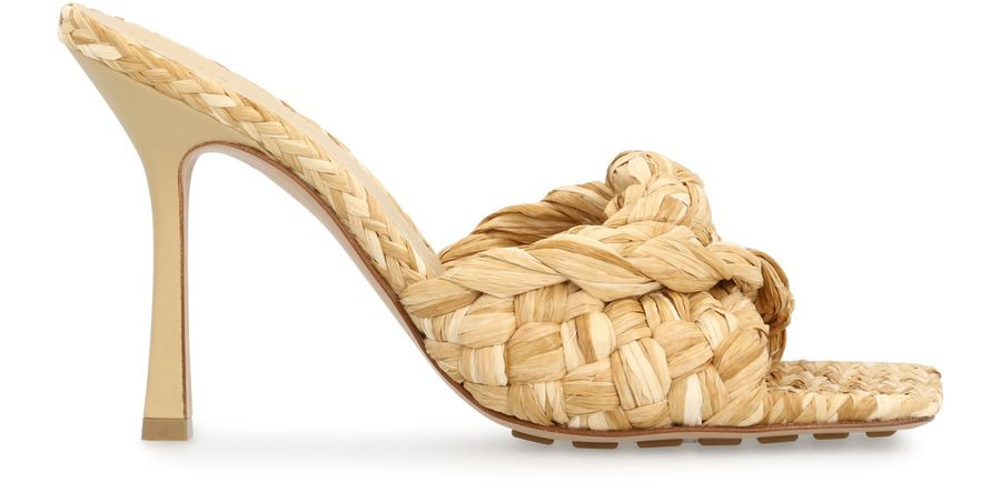 Adorned with the famous Intrecciato braid and daring twists, these stiletto heel sandals are a refined, contemporary creation designed by Bottega Veneta. DESCRIPTION - Intrecciato raffia mule sandals with an elongated squared toe - Open square toe - Twisted strap - Stiletto heel - Leather covered stiletto heel - Rubber-injected leather outsole DETAILS AND CARE MATERIAL: viscose 100% HEEL HEIGHT: 10.5 cm / 4.1 " COLOR: macadamia COUNTRY OF MANUFACTURE: Italy PRODUCT CODE: BOTD58WZBEISI40500 The model is 5ft 10in / 1.79m tall and wears a size EU 39.5.