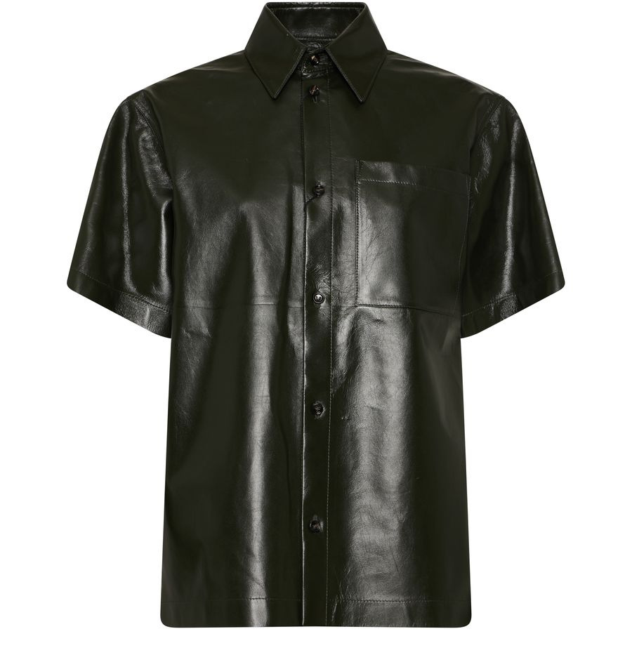 DESCRIPTION - Very soft to the touch - Classic collar - Breast pocket - Front buttoned closure - Short sleeves - Visible stitching DETAILS AND CARE MATERIAL: 100% Lamb leather COLOR: dark_green COUNTRY OF MANUFACTURE: Italy PRODUCT CODE: BOT4N335GEET2AA100