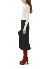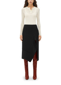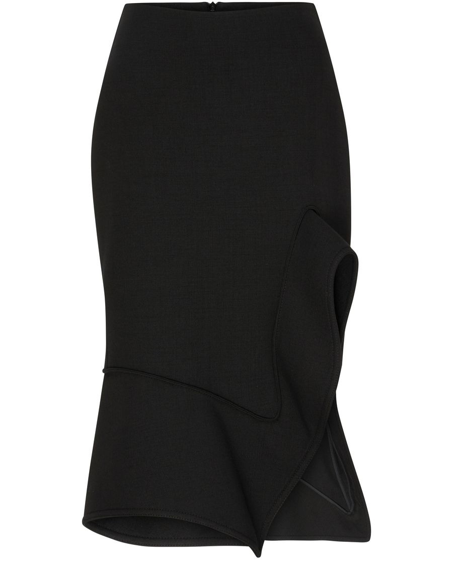 DESCRIPTION - Midi skirt - Front left slit - High-waisted fit - Asymmetric cut DETAILS AND CARE MATERIAL: 35% Cotton, 35% Viscose, 25% Wool, 5% Polyamide COLOR: black COUNTRY OF MANUFACTURE: Italy PRODUCT CODE: BOTRU85XBCKNA1AA00