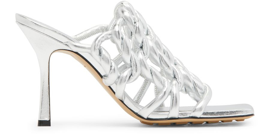 DESCRIPTION - Heeled mules - Stiletto heel - Open square toe - Notched sole DETAILS AND CARE MATERIAL: 100% Lamb leather HEEL HEIGHT: 10 cm / 3.9 " COLOR: silver COUNTRY OF MANUFACTURE: Italy PRODUCT CODE: BOTM8JR5SILE2A1A00