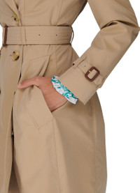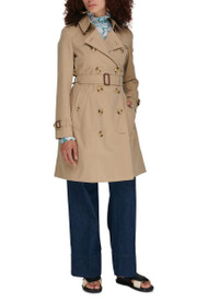 Chelsea trench coat is a timeless piece with a three-quarter length design. It features a classic notched collar and an adjustable collar with a hook, adding versatility to the style. The coat also includes straps on the shoulders for an added touch of detail. With a double-breasted fastening and belt loops, it offers a flattering silhouette. Side pockets provide functionality while completing the coat's overall aesthetic. DESCRIPTION - Three-quarter length trench coat - Notched collar - Adjustable collar with hook - Straps on the shoulders - Double-breasted fastening - Belt loops - Side pockets DETAILS AND CARE MATERIAL: 100% Cotton COLOR: honeyy COUNTRY OF MANUFACTURE: United Kingdom PRODUCT CODE: BUR7P52QBE1TOA1101 The model is 5ft 10in / 1.79m tall and wears a size UK 10.