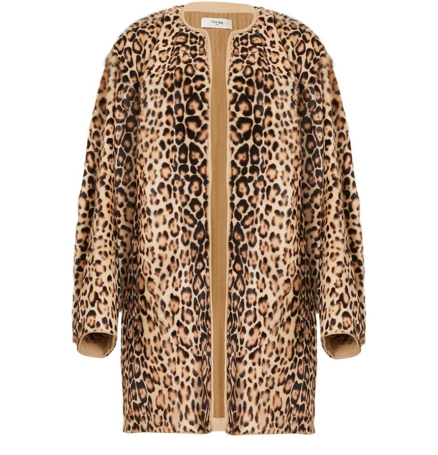 DESCRIPTION - Loose Fit - Crew Neck - Long Sleeves - Dropped Shoulders - Diagonal Side Pockets DETAILS AND CARE MATERIAL: 100% Goatskin/100% Viscose Celine Striped Jacquard Lining/ COLOR: leopard COUNTRY OF MANUFACTURE: Italy PRODUCT CODE: CELU9ZTDMULNA1AA00