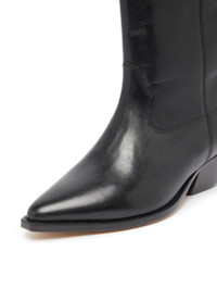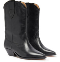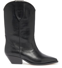 Discover the luxurious Isabel Marant Duerto boots. Crafted with a leather outer sole, the high-top upper and pointed toe create a sophisticated silhouette. The visible stitching adds a subtle detail, while the very soft touch brings comfort to each step. Elevate any outfit with these timeless and versatile boots. DESCRIPTION - Very soft to the touch - Leather outer sole - Visible stitching - Pointed toe - High-top upper DETAILS AND CARE MATERIAL: Main material : 100% Calf leather / Lining : 100% Calf leather / Outer sole : 100% Cow leather HEEL HEIGHT: 5 cm / 2 " COLOR: black COUNTRY OF MANUFACTURE: Portugal PRODUCT CODE: IMAY242XBCK7E11A00