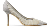 Love 85 Metallic Silver Glitter Fabric Pumps with Ivory Tulle Overlay