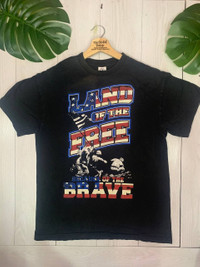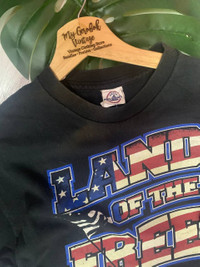 THANK VERY MUCH FOR VISIT OUR PAGE.PLEASE READ CAREFULLY OUR DESCRIPTION AND SATISFIED FIRST RARE!! Shirts LAND OF FREE Size on tag: S Shirt still in good Condition 8/10 Actual Measurement : Length arm pit to arm pit : 18 Inches Length back collar to hem :27 Inches Please look detail at the photo for confirmation. If any question please ask to me. **Please dont expect the pieces in mint condition unless state.Its because vintage or used item may have sign of wear.TQ Important: Telephone number is required for standard shipping detail price nego until letgo. (Ref No:34)