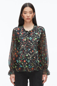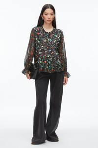 Our romantic long sleeve blouse features the seasonal “Bliss Floral” print—an artful scattering of wildflowers on lightweight silk twill, layered with sheer, textured chiffon for added dimension. Designed with soft pleats and a relaxed silhouette, it moves with ease, while ruffled cuffs and a tie neckline add a feminine finish. Polished yet effortless, it’s a versatile piece that pairs just as well with denim for day as it does with the matching skirt for a striking take on occasion dressing. - 100% Silk - Model is 5'10', Bust: 30', Waist: 23', Hips: 34' and wearing a size 4 - Professional dry clean only