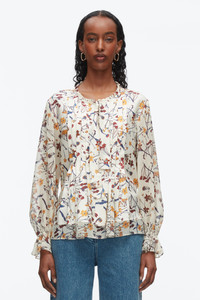 Our romantic long sleeve blouse features the seasonal “Bliss Floral” print—an artful scattering of wildflowers on lightweight silk twill, layered with sheer, textured chiffon for added dimension. Designed with soft pleats and a relaxed silhouette, it moves with ease, while ruffled cuffs and a tie neckline add a feminine finish. Polished yet effortless, it’s a versatile piece that pairs just as well with denim for day as it does with the matching skirt for a striking take on occasion dressing. - 100% Silk - Model is 5'10', Bust: 30', Waist: 23', Hips: 34' and wearing a size 4 - Professional dry clean only