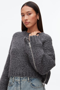 A modern knit with a tactile twist. This cropped sweater is spun from a richly textured wool blend boucle that adds dimension and warmth without bulk. The relaxed silhouette features extra-long sleeves and functional zippers along the sides—wear them closed for a clean shape or slightly open for a layered, deconstructed edge. Cozy and directional, it’s the perfect knit to anchor cool-weather looks with subtle attitude. - 32% Wool, 25% Acrylic, 18% Alpaca, 14% Nylon, 10% Cotton, 1% Elastane - Model is 5'10', Bust: 30', Waist: 23', Hips: 34' and wearing a size 4 - Professional dry clean only