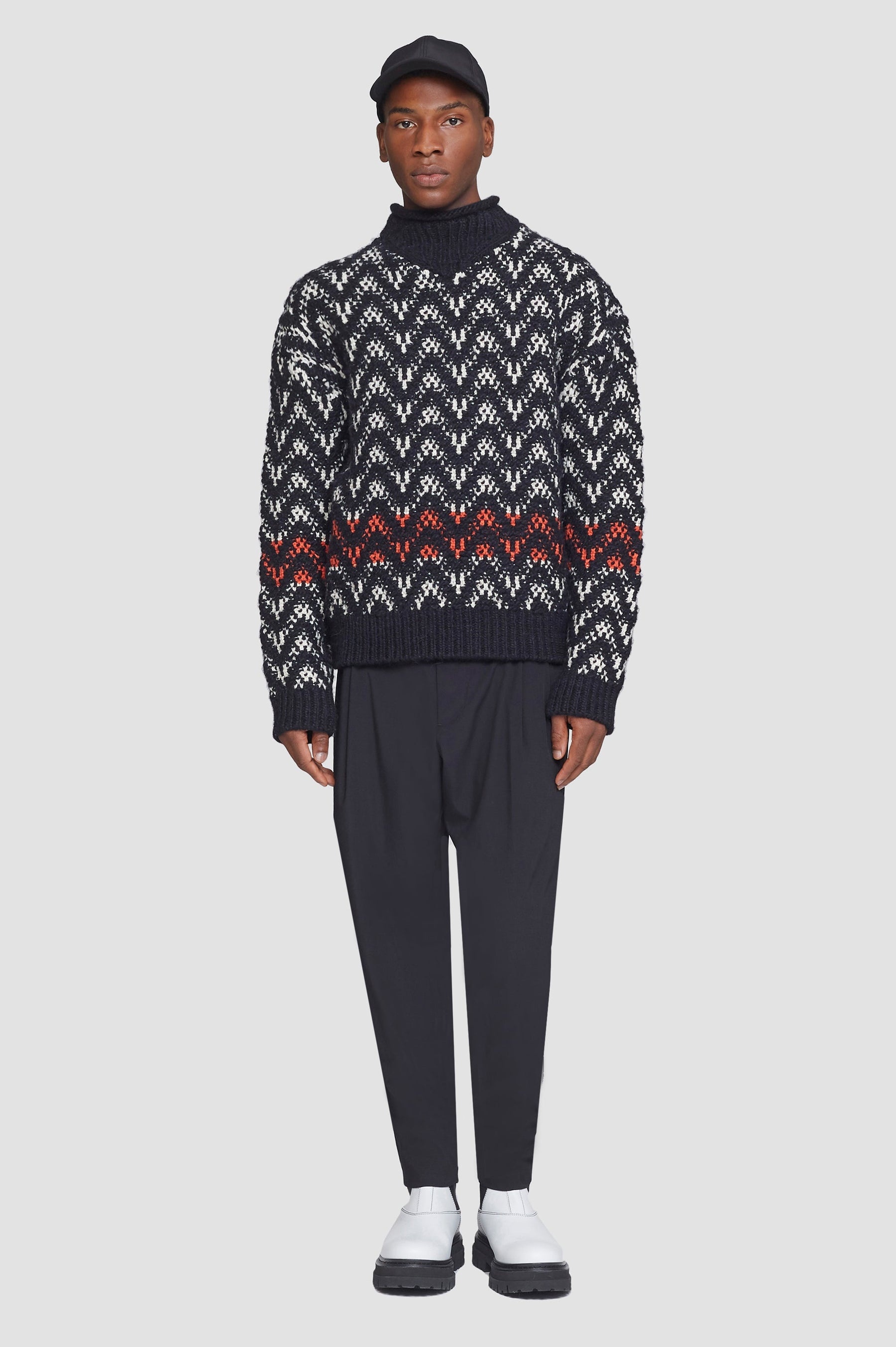 Chevron jacquard pullover in an organic wool and alpaca blend. Features a mock neck and long sleeves. Contrast ribbed trims. - 48% Wool, 20% Polyamide, 17% Acrylic, 15% Alpaca - Justin’s Measurements are Height: 6'1", Inseam: 32”, Waist: 28", Chest: 33”, Suit: 34R" and is wearing a size M - Professional dry clean only