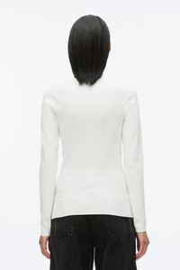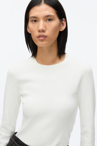 This Compact Rib Long Sleeve Tee is knitted from a viscose yarn for a sleek, close-to-body fit. it features subtle ottoman trim detailing that adds texture to its minimalist silhouette. The long sleeves and crewneck design make it a versatile piece that pairs effortlessly with wide leg jeans or layers beautifully under structured outerwear. Perfect for a clean, modern look that transitions seamlessly from day to night. - 83% Viscose,17% Polyester - Model is 5'10', Bust: 30', Waist: 23', Hips: 34' and wearing a size Small - Professional dry clean only