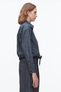A modern take on the classic chambray shirt. This cropped silhouette is cut from soft, lightweight chambray and finished with a drawstring hem that allows you to adjust the shape—from relaxed to subtly cinched. Designed with a sharp collar, clean button front, and elongated cuffs, it balances ease with refined structure. Pair it with high-rise denim or tailored trousers for an effortless, everyday uniform. - 100% Cotton - Model is 5'10', Bust: 30', Waist: 23', Hips: 34' and wearing a size 4 - Professional dry clean only