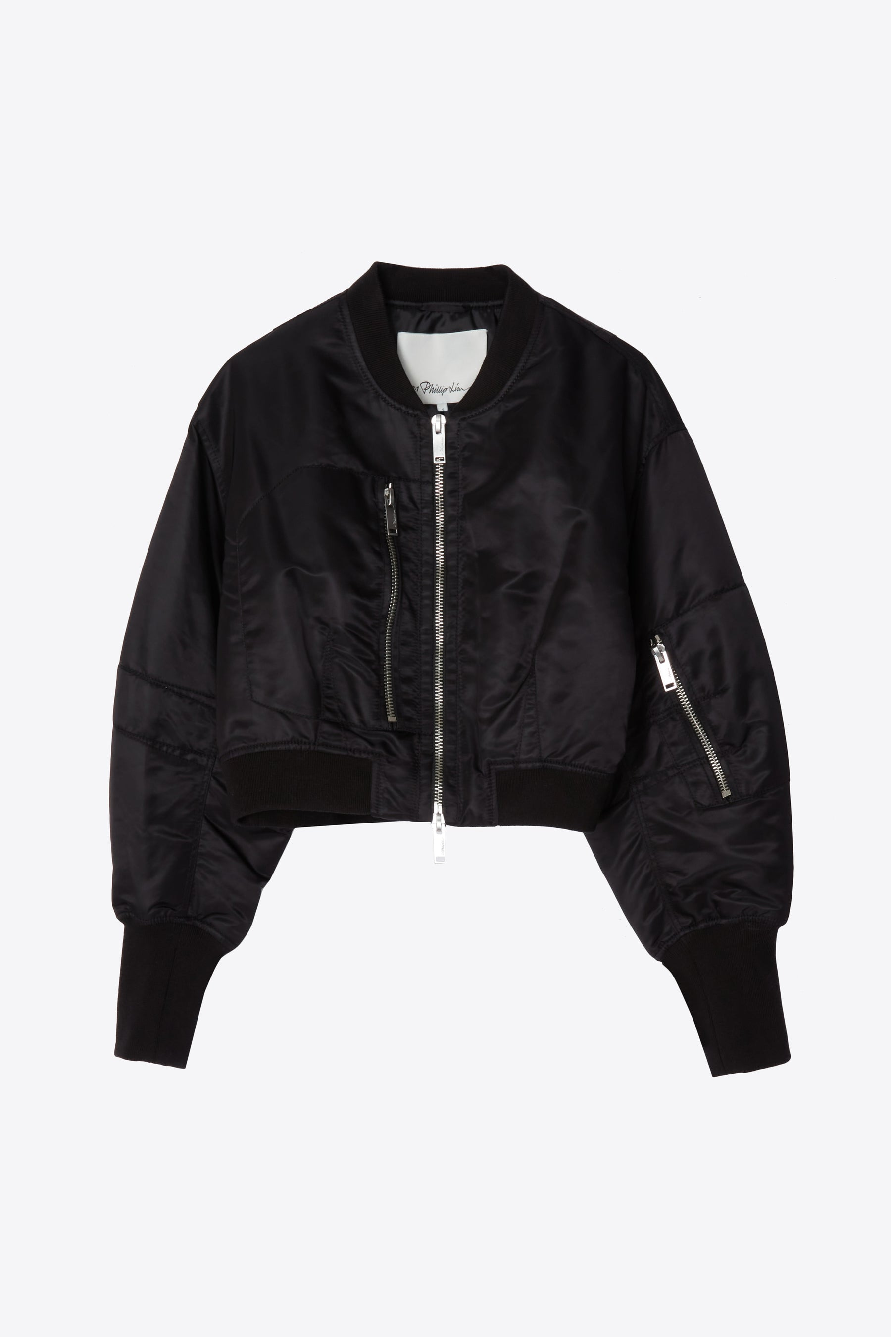 Sample sale style from the 3.1 Phillip Lim archives. Offered for final sale for a limited time. Limited quantity available. A forever staple, reimagined for today. This cropped bomber jacket is cut from classic flight nylon with an exaggerated silhouette inspired by vintage aviation styles. The shrunken length and dropped shoulders bring a modern edge, while signature details—ribbed knit trims, utility zip pockets, and a double zipper—ground it in function. Throw it over a tank or slip dress for an effortless take on tough-meets-feminine. - 100% Nylon - Model is 5'10', Bust: 30', Waist: 23', Hips: 34' and wearing a size 4 - Professional dry clean only