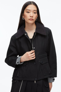 A flirty take on the classic barn jacket, this cropped silhouette is designed with a subtle flounce hem that gently emphasizes the waist—balancing femininity with functional edge. Crafted from a yarn-dyed woven fabric, its structured shape is offset by playful details: contrast gingham cuffs, a soft corduroy collar, and oversized flap pockets. An adjustable waist cinch nods to utilitarian roots. Wear it with the matching cargo pant for a coordinated set, or throw it over chunky knits for an easy, polished layer. - 100% Cotton - Model is 5'10', Bust: 30', Waist: 23', Hips: 34' and wearing a size 4 - Professional dry clean only