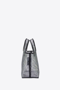 Mini market tote is a playful take on a lunch bag, realized in crystal mesh. With a silver-tone metal logo plaque. - 100% Polyurethane - Height: 8" - Width: 13" - Depth: 5" - Handle Drop: 4.5