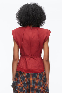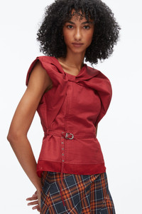 Crafted from Italian ottoman weave with tonal sheer insets, this draped top offers a playful twist on occasion dressing. A sculptural bow neckline and built-in belt with signature hardware accentuate the waist, while the crisp-yet-fluid silhouette strikes a balance between strength and softness. Pair with denim for an unexpected contrast or with the matching skirt for a head-turning set. - 57% Cotton, 43% Polyester - Model is 5'10', Bust: 30', Waist: 23', Hips: 34' and wearing a size 4 - Professional dry clean only