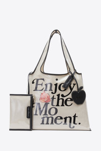 The 3.1 Market Tote is a medium size shopping tote designed for everyday use. crafted in printed canvas with “Enjoy the Moment” messaging and clear TPU panels. It has an Apple shaped stamped leather charm with attached interior pouch for your essentials. - 50% Cotton, 25% Polyurethane, 25% Thermoplastic Polyurethane - Lining: Unlined - Height: 13" - Width: 15" - Depth: 8.3" - Handle Drop: 10"