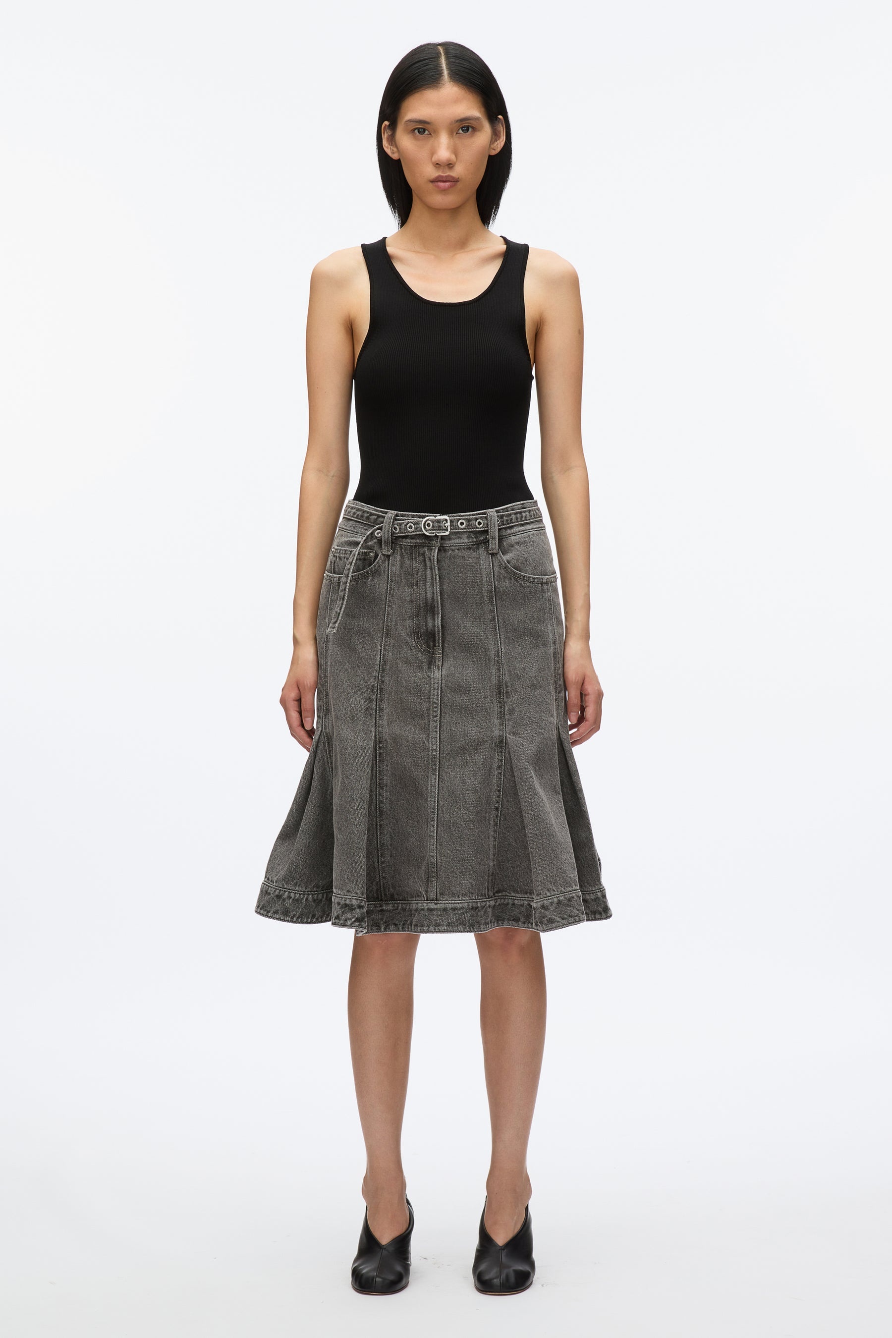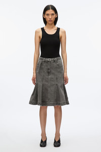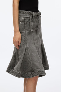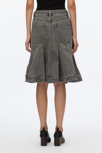Blurring the line between pragmatic and romantic, this denim skirt offers a fresh, elevated twist on a timeless classic. The flirty, flounce hem adds unexpected volume and movement, while the acid wash introduces a grungy, lived-in feel. The contrast between the raw edge and the feminine silhouette creates a bold yet effortless statement piece, perfect for pairing with both tailored and casual looks. - 100% Cotton - Model is 5'10', Bust: 30', Waist: 23', Hips: 34' and wearing a size Small - Professional dry clean only