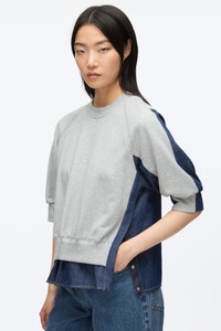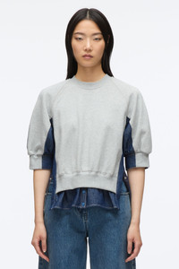 Elevating the everyday, this hybrid sweatshirt transforms casual dressing with a striking blend of textures. Soft heathered grey fleece meets structured indigo denim, crafting a silhouette that’s both contemporary and refined. Subtly gathered 3/4" raglan sleeves and signature side snap detailing add a touch of versatility and design-forward edge. - 100% Cotton - Model is 5'10', Bust: 30', Waist: 23', Hips: 34' and wearing a size 4 - Professional dry clean only