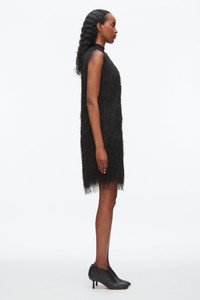 Effortlessly blending texture with casual glamour, this dress features a sleeveless silhouette adorned with fine, dynamic detailing that moves gracefully with you. The contrasting mockneck trim adds a refined touch, balancing the tactile surface with clean, modern lines. Subtly striking, it’s designed to transition seamlessly from day to night. Pair it with minimalist accessories for a polished look that embodies understated elegance. - 100% Polyester - Model is 5'10', Bust: 30', Waist: 23', Hips: 34' and wearing a size 4 - Professional dry clean only