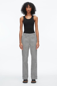 A refined approach to tailoring. These elongating pants feature a subtle flare and are crafted from Italian jaspe wool—yarn-dyed and woven with a mix of three tones to create a softly variegated stripe. The clean waistband and pressed creases enhance the tailored finish, while cuffed hems introduce a relaxed edge. - 48% Wool, 26% Cotton, 26% Polyester - Model is 5'10', Bust: 30', Waist: 23', Hips: 34' and wearing a size 4 - Professional dry clean only