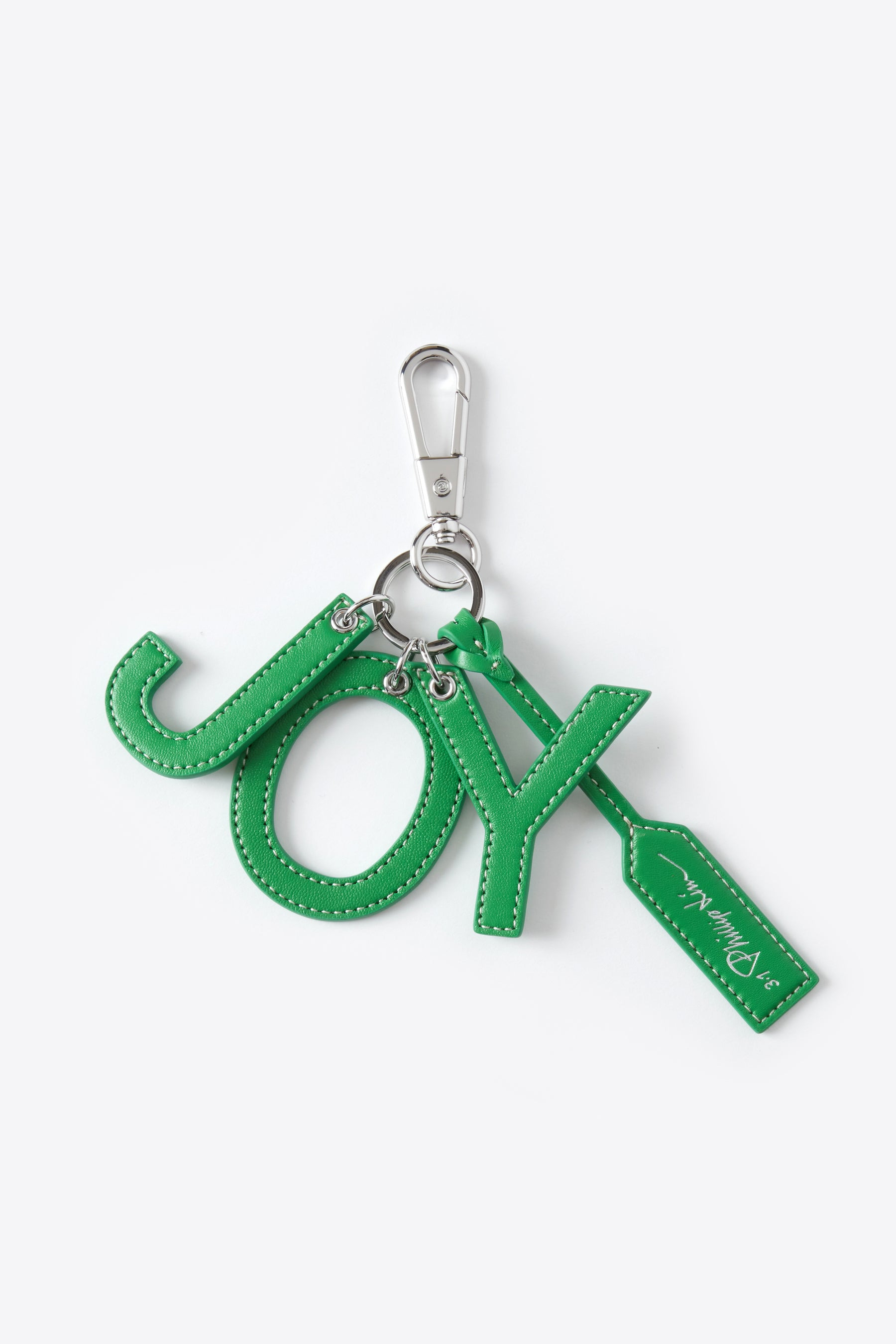 Sample sale style from the 3.1 Phillip Lim archives. Offered for final sale for a limited time. Limited quantity available. A little dose of happiness to carry with you everywhere. This playful keychain spells out “JOY” in bold, bright leather, complete with contrast stitching and a polished metal clasp for easy attachment. Clip it onto your bag, keys, or belt loop for a touch of optimism wherever you go. - 50% Cow Leather, 25% Glass Stones, 25% Microfiber - Height: 7.1" - Width: 6" - Depth: 0.2"