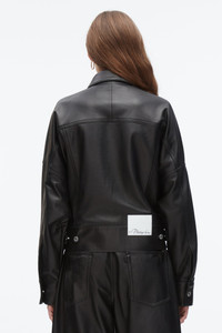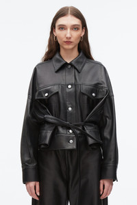 Crafted from supple Italian plonge lamb leather, this jacket reimagines our bestselling silhouette with a polished, edgy sensibility. The boxy cut nods to New York City’s spirit of experimentation, while adjustable self-ties at the waist allow for a personalized fit and added dimension. Finished with flap chest pockets and signature snap hardware, it’s a versatile layer that brings everyday looks into sharper focus. Pair it with the matching barrel-leg leather jean for a head-to-toe statement in modern luxury. - 100% Lamb Leather - Model is 5'10', Bust: 30', Waist: 23', Hips: 34' and wearing a size 4 - Professional dry clean only