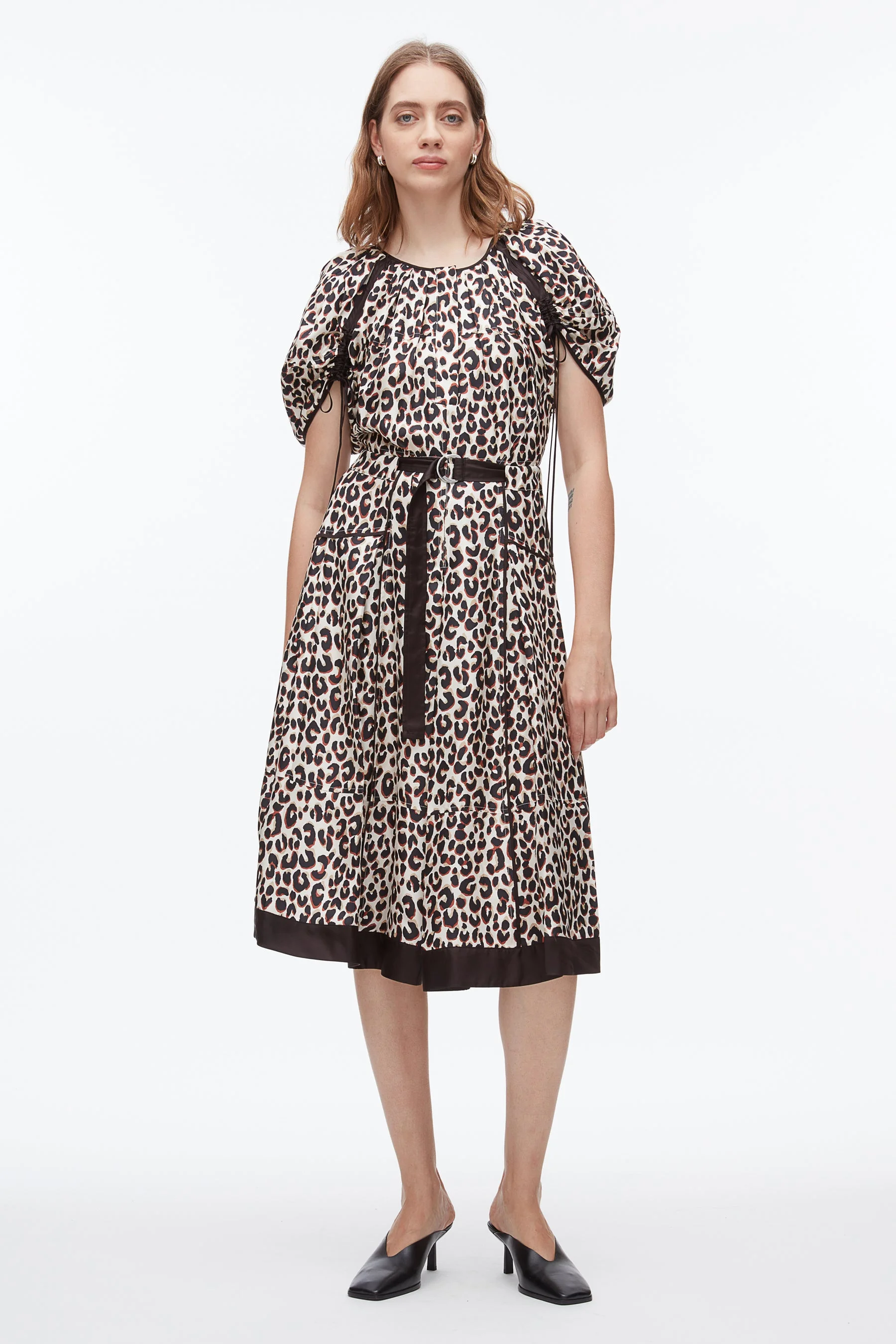 Embrace statement dressing with this refined midi dress, cut from leopard-print silk blend twill. The silhouette features softly gathered sleeves framed by delicate ruffle trim, while subtle gathering at the neckline and bodice adds a feminine touch. A tie belt offers gentle definition without disrupting the ease of the shape, and a contrast hem grounds the look with a modern finish. Striking yet effortless, it transitions smoothly from weekday polish to weekend plans—pair with heels for a refined look or keep it casual with understated flats. - 52% Silk, 48% Viscose - Model is 5'10', Bust: 30', Waist: 23', Hips: 34' and wearing a size 4 - Professional dry clean only