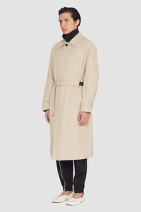 Balmacaan trench coat in cotton and nylon blend twill with a water repellent finish. Point collar and long sleeves with snap button cuff adjusters. Waist belt with contrast back panel and silver toned metal D-ring buckle. Hand pockets and a single internal chest pocket. Side vents with concealed snap button closure. Concealed front placket and button closure. Unlined. Calf length. Relaxed fit. - Point collar - Long sleeves with snap button cuff adjusters - Waist belt with silver toned metal D-ring buckle - Side hemline slits with concealed snap button closure - Concealed button front closure - Relaxed fit - Model Height: 6" 1/2, Waist: 29', Hips: 35' and wearing a size M