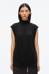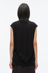 An exercise in understated elegance, this tissue-weight knit top redefines everyday essentials. Featuring delicate chiffon godet panels with functional snaps, it allows for customizable styling. The softly gathered neckline adds subtle texture, enhancing the relaxed yet sophisticated silhouette. Pair with tailored trousers or layered for effortless versatility. - 60% Modal, 40% Wool - Model is 5'10', Bust: 30', Waist: 23', Hips: 34' and wearing a size Small - Professional dry clean only
