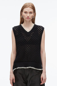 This sleeveless V-neck shell is crafted from chunky yet breathable organic mercerized cotton. Featuring openwork stitches for an airy, textural feel, it’s finished with contrast crochet trim for a playful accent. Side seam zippers add styling versatility—wear them closed for structure or open for ease. A joyful piece designed for transitional dressing, perfect layered over shirting or worn solo on sunlit days. - 100% Cotton - Model is 5'10', Bust: 30', Waist: 23', Hips: 34' and wearing a size 4 - Professional dry clean only