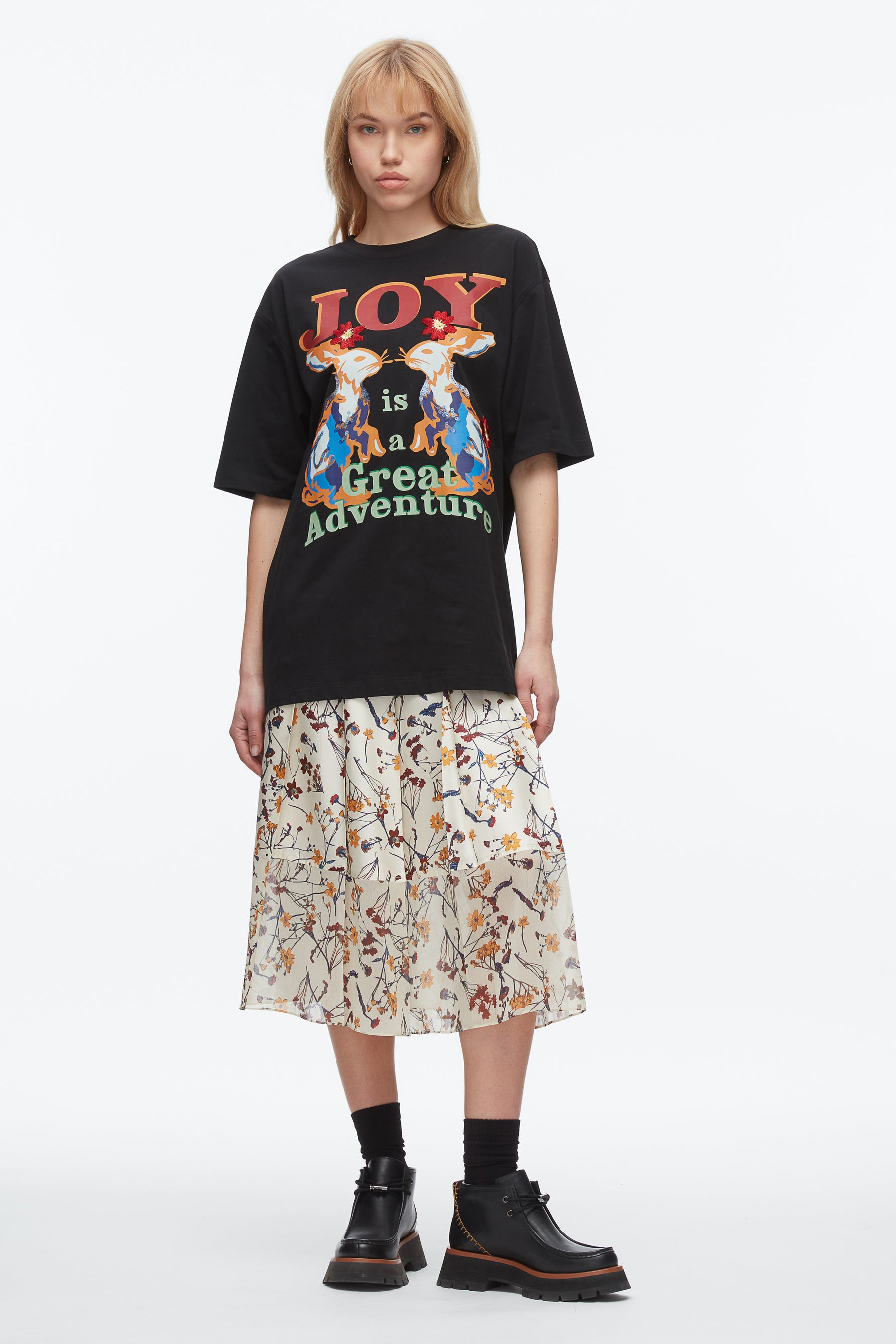 Our souvenir-style oversized cotton jersey tee features a bold “Joy is a Great Adventure” slogan, framed by mirrored rabbit graphics adorned with sequins and embroidered florals for a touch of sparkle. Wear it loose over cargo pants for effortless cool, or juxtaposed with a ladylike skirt for a modern mix. - 100% Cotton - Model is 5'10', Bust: 30', Waist: 23', Hips: 34' and wearing a size 4 - Professional dry clean only