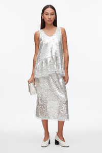 Going out? Our shimmering tank is crafted from paillette sequins that catch the light with dreamy delight. Finished with a lace-trimmed organza hem and bow-tie closures, it can be worn front to back for two looks in one. Pair it with the matching skirt for an ethereal take on cocktail hour, or style it with our Fringe mini and boots for a night on the town. - 70% Nylon, 30% Metal - Model is 5'10', Bust: 30', Waist: 23', Hips: 34' and wearing a size 4 - Professional dry clean only