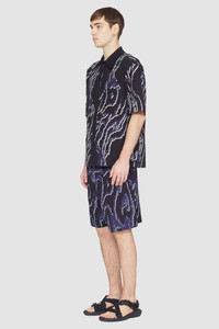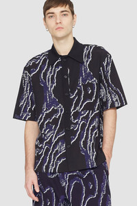 Short sleeve printed bowling shirt in a cotton and rayon blend. Ribbed knit point collar and placket. Chest patch pocket. Button front closure. Relaxed fit. - Ribbed-knit point collar and placket - Short sleeves - Chest patch pocket - Button front closure - Relaxed fit - Model Height: 6' 1/2, Waist: 29', Hips: 35' and wearing a size M