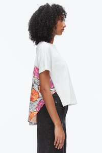 A classic silhouette with a twist, the short sleeve tee pairs a clean front with a vibrant, unexpected back panel. Featuring a bold floral collage that blooms across the rear, this tee brings playful contrast and fresh energy to your everyday wardrobe. - 100% Cotton - Model is 5'10', Bust: 30', Waist: 23', Hips: 34' and wearing a size 4 - Professional dry clean only