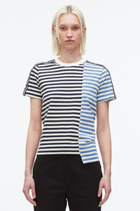 Designed for the curious adventurer and the free spirit at heart. This short sleeve tee playfully reimagines the everyday stripe, splicing classic navy with sky blue in a bold misalignment. Crafted from soft, yarn-dyed cotton jersey, it’s finished with a ribbed neckline and contrast eyelet grosgrain trim for a subtle touch of edge. Full of personality yet endlessly wearable—this is the kind of piece you’ll reach for again and again. - 100% Cotton - Model is 5'10', Bust: 30', Waist: 23', Hips: 34' and wearing a size 4 - Professional dry clean only