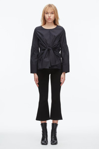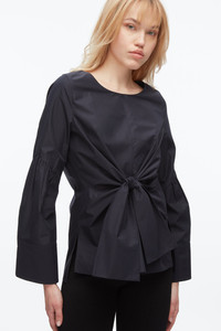 A modern romantic with a twist. This long sleeve poplin blouse features a sculptural front tie that defines the waist, while the softly gathered sleeves add volume and a touch of drama. Designed in crisp cotton with a clean bateau neckline, it’s polished enough for the office but playful enough for dinner plans. Wear it with tailored trousers or denim—it’s a versatile piece that shifts effortlessly from day to night. - 70% Cotton, 30% Polyester - Model is 5'10', Bust: 30', Waist: 23', Hips: 34' and wearing a size 4 - Professional dry clean only