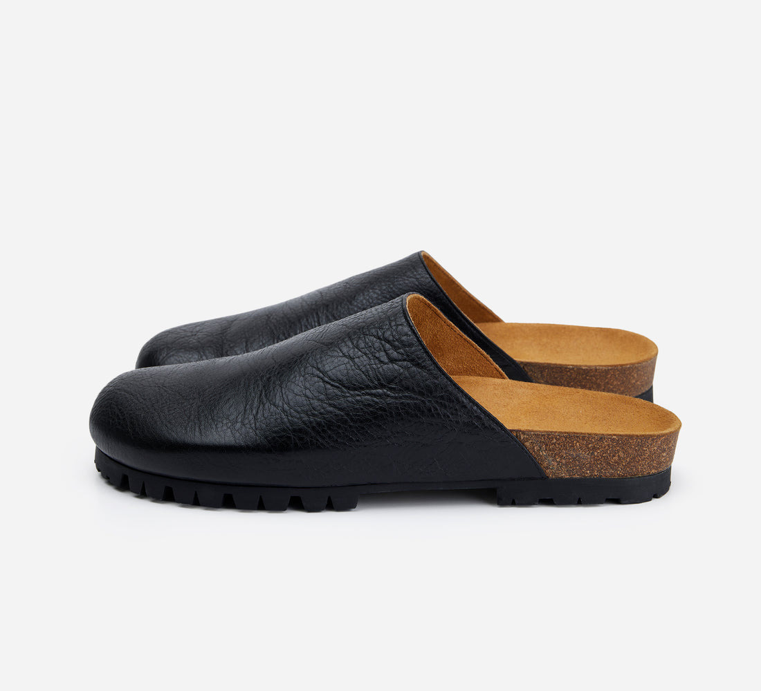 Our mules are an in-house design that is manufactured for us in Portugal. For our 20th anniversary, we partnered with Horween to develop a brand new horsehide tannage. The leather sports a beautiful black color with brown undertones that are visible from day one, ensuring a leather that will age quickly and beautifully as it’s worn. For comfort and extra traction, the mules are built on a cork footbed atop a Vibram commando sole. The upper will stretch and mold to your foot as it breaks in. Made in Portugal. SIZING: We recommend taking your usual Birkenstock Boston size, but if your feet have a higher instep you may want to consider going up one size. What's most important when putting these mules on for the first time is to assess where your heel is hitting on the cork sole and how much room you have in the front of the shoe. The upper will stretch, so if the mule feels a little snug at first against your forefoot but you have room in the front, you can trust that it will mold to your foot with wear. Details - Horween horsehide - Leather lining - Suede footbed - Cork sole - Vibram commando outsole - Made in Portugal
