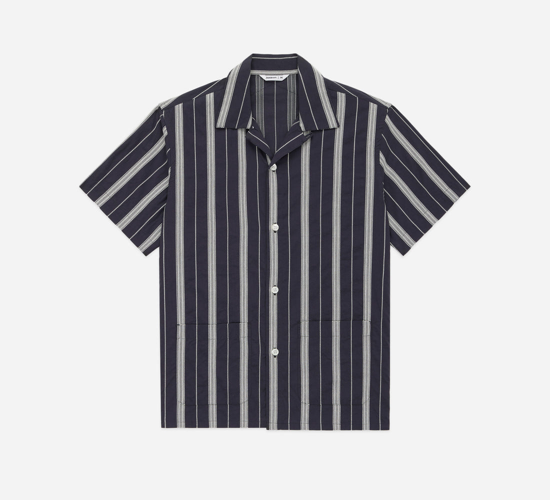 The Cabana Shirt is a 3sixteen take on the classic guayabera shirt. It features an open collar with loop closure, lower hip pockets, and a relaxed fit. For SS25, we've employed a cotton poplin fabric with a ticking stripe detail woven in. Mother of pearl buttons finish it off. Details - 100% Cotton - Single front chest pocket - Open Collar - Mother of pearl buttons - Crossed back yoke - Made in Portugal