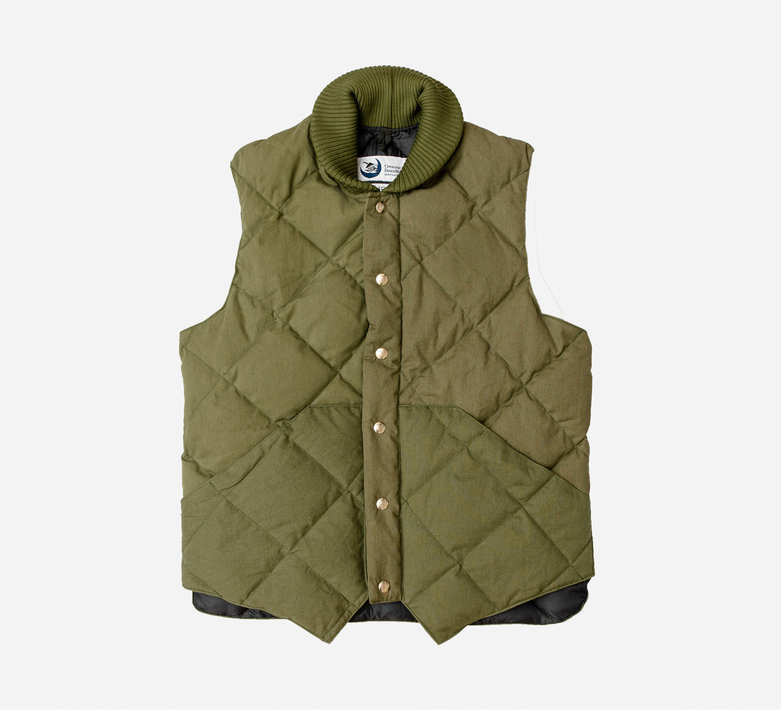 For our 20 year anniversary, we teamed up with Crescent Down Works to re-run a special run of our much sought after down vests made out of repurposed vintage military fabrics. We mixed and matched the covers into the vest patterns to give them a patchwork-style look, so no two pieces are alike. Made in USA. Please note: Each vest is unique, and the photos on this product page are not representative of the vest you will receive. You will not receive the exact vest photographed, but it will look similar. We were unable to photograph each vest as they are all distinct due to the nature of the vintage fabric that was used to create them. Details - Vintage US Military sleeping bag cover fabric - Down fill - 2-way zip closure - Rib collar - Made in USA