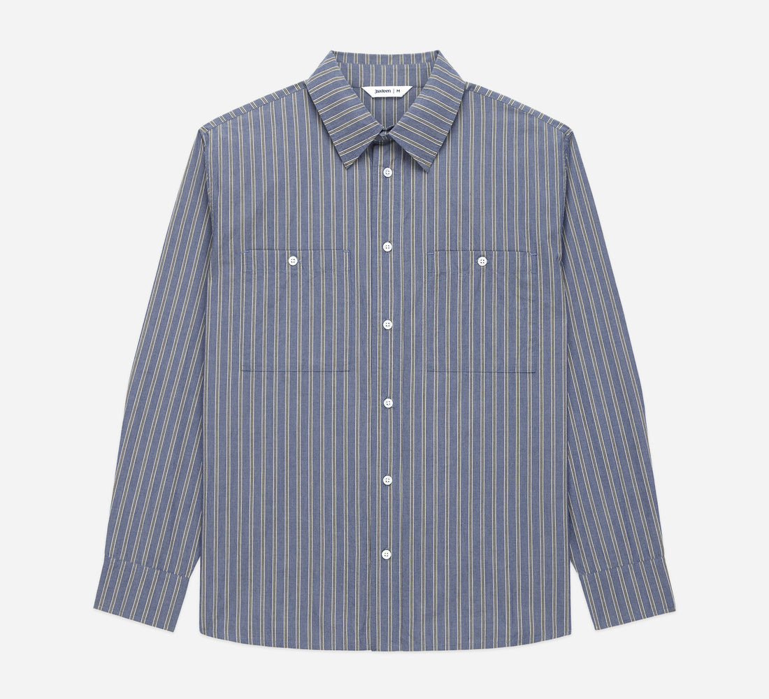 The Commuter Shirt is a more casual take on a classic dress shirt. Sewn up in a crisp striped poplin fabric from Japan, the shirt is cut with a wide chest and shoulders and looser sleeves. The generous proportions are matched with a carefully considered length and sleeve length so the shirt maintains its oversized feeling without appearing too big. The shirt features two large chest pockets in reference to vintage work shirts. Made in India. Details - 100% cotton fabric woven in Japan - Mother of pearl buttons - Made in India