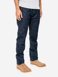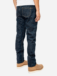 The CT-100xk jean features a beautiful loomstate raw indigo selvedge denim which is custom woven exclusively for 3sixteen by Kuroki Mills. This denim has been woven at low tension to give it a rough, abrasive hand that will yield beautiful fading results over time. We then give the jean a rinse to eliminate shrinkage and bring out the texture and character of the fabric even further. Our CT cut is a blend of our CS (Classic Straight) and ST (Slim Tapered) fits which results in a jean that provides a high rise, room in the top block and a taper from the knee down. Trims include gunmetal YKK punch-through rivets and shanks, and a natural tan roughout leather patch. Made in USA. Sizing: This jean has been given a hot rinse, so further shrinkage is minimal. You can expect the waist to stretch 1-1.5" over the first 30 wears. Details - 14oz raw indigo selvedge woven in Okayama, Japan - Low tension unsanforized denim (rinsed- no shrinkage) - Double redline selvedge ID - Tan roughout leather patch - Made in USA