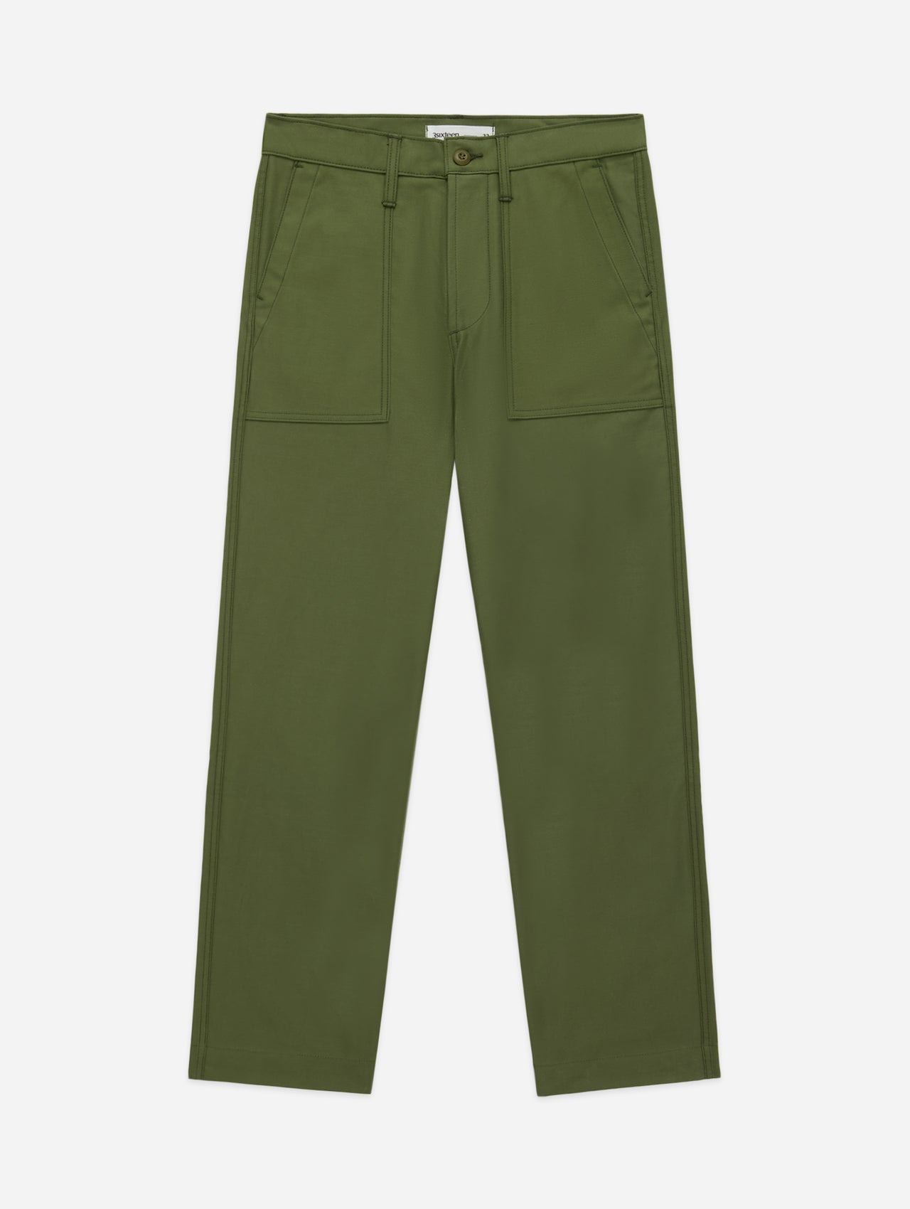 Our Fatigue Pant takes design cues from the military surplus pant that was standard issue for the US Army. This pant silhouette features a straight leg, higher rise, and roomy top block with a slight taper. This version features a replica of the back satin fabric found on vintage deadstock OG107 fatigues that is painstakingly woven in Japan to exacting standards. The pant is finished with BDU buttons that are designed to look and feel like the original. Details - 100% cotton back satin woven in Japan - Replica BDU buttons - Gusseted back pockets - Made in USA