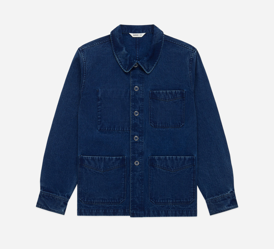 The French Work Jacket is our most accurate representation of the European three pocket work jacket yet. The collar has the traditional rounded shape found on the pieces we reference along with an interior pocket and three large front pockets. The fabric is a heavyweight Japanese indigo HBT that's been bleached and stonewashed to give the look and feel of the old French examples in our archives. We finished the jacket off with metal painted buttons that have been tumbled in a drum to mimic the look of vintage workwear buttons that have faded from use over time. To the untrained (and maybe even trained) eye, this jacket looks like it's decades old, but is something that's ready for decades of wear. Details - 100% Cotton HBT fabric woven in Japan - Yarn dyed indigo - Corozo buttons - Stonewash treatment - Made in India