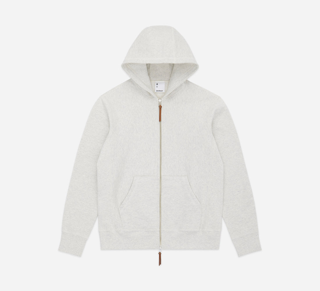 We've updated our heavyweight hoody with several improvements from previous runs: it now features an even beefier 500gsm fleece and a slimmer fit. Lastly, the hood drawstring has also been eliminated for a cleaner look. The Oatmeal colorway is the newest addition to our fleece lineup. Made in Canada. PLEASE NOTE: Remove leather zip pulls before washing. Details - Preshrunk heavyweight 500gsm fleece - Gunmetal YKK double zipper - 3 piece hood construction - Rawhide leather zipper pulls - 99% cotton / 1% polyester - Made in Canada