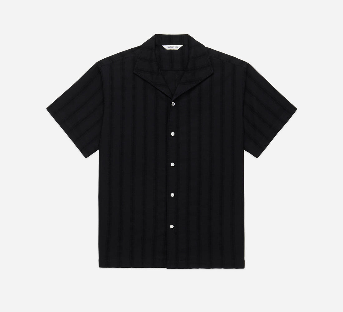 Our Leisure Shirt is modeled after vintage 1950's open-collar vacation shirts. This iteration utilizes a Japanese striped lace weave with a beautiful texture. The shirt is finished with mother of pearl buttons. Details - 100% Cotton woven in Japan - Pattern-matched straight back yoke - Open spread Collar - Mother of pearl buttons - Made in India
