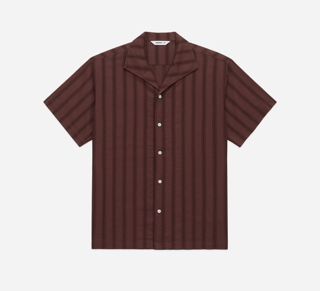 Our Leisure Shirt is modeled after vintage 1950's open-collar vacation shirts. This iteration utilizes a Japanese striped lace weave with a beautiful texture. The shirt is finished with mother of pearl buttons. Details - 100% Cotton woven in Japan - Pattern-matched straight back yoke - Open spread Collar - Mother of pearl buttons - Made in India